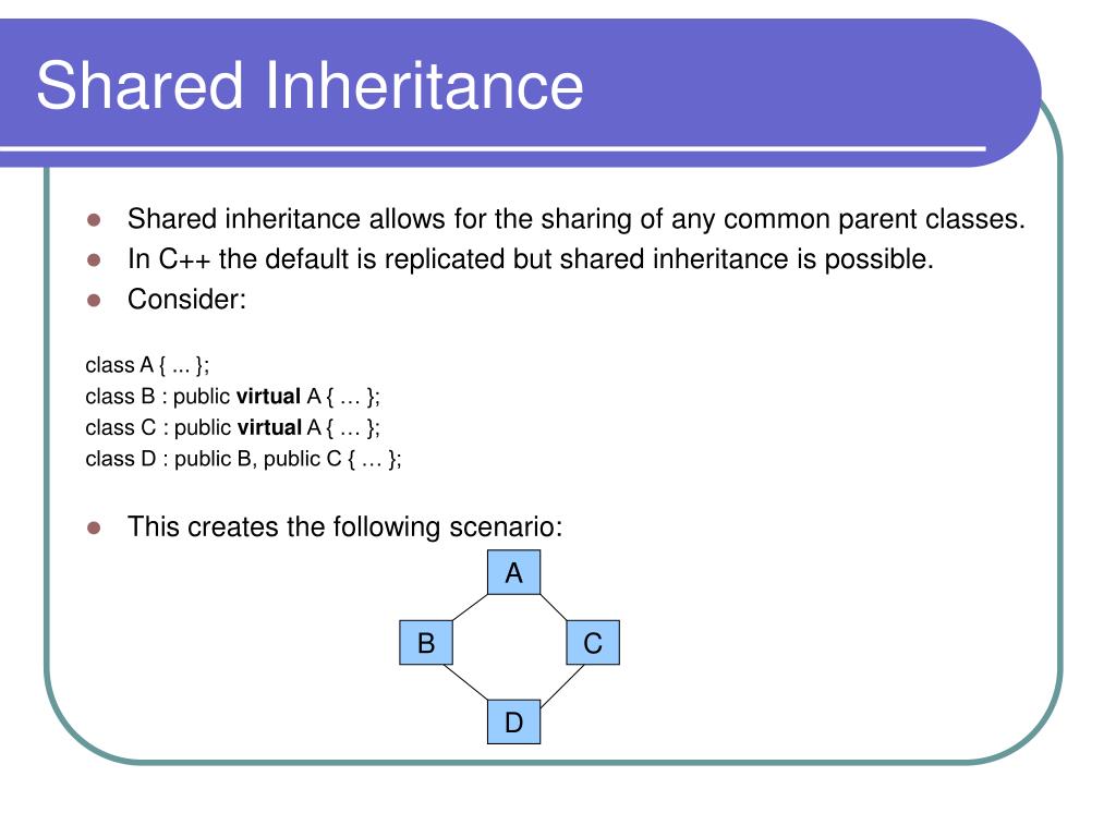 Shared Inheritance • Shared inheritance allows for the sharing of any common parent classes. • In C++ the default is replicated but shared inheritance is possible. • Consider: class A { ... }; class B : public virtual A { … }; class C : public virtual A { … }; class D : public B, public C { … }; • This creates the following scenario: A B C D
