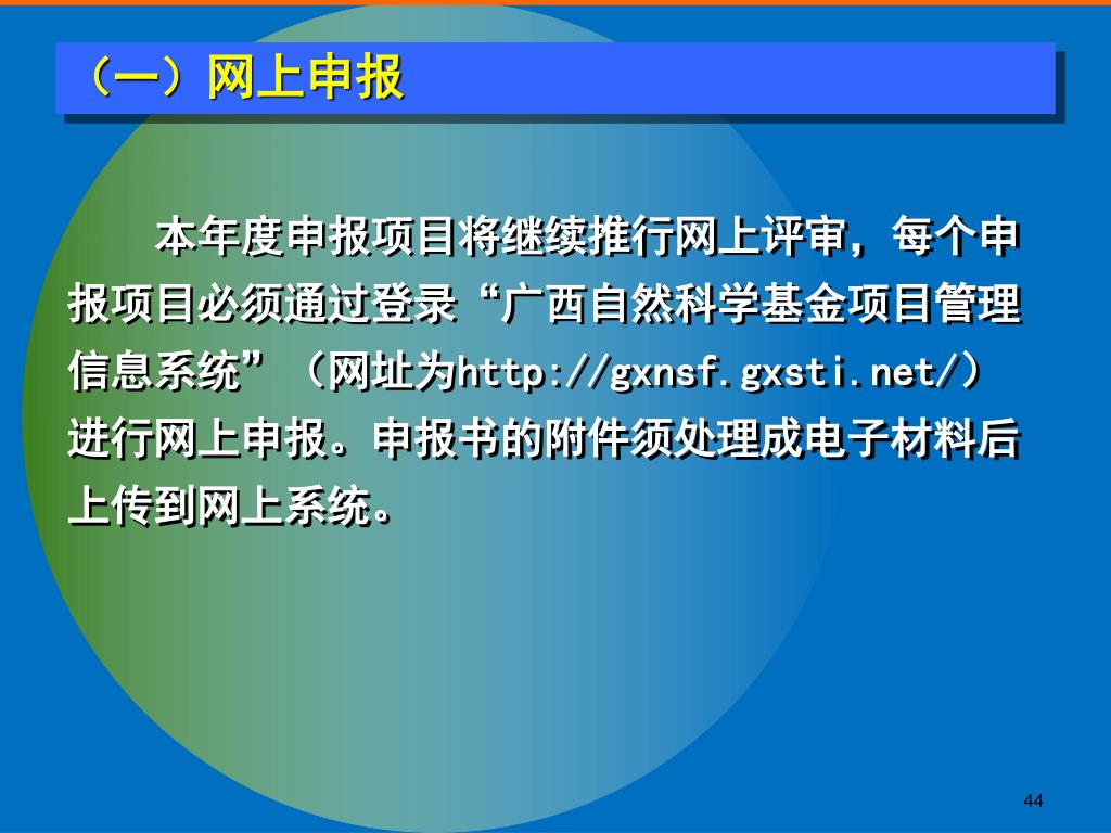本年度申报项目将继续推行网上评审,每个申报项目必须通过登录“广西自然科学基金项目管理信息系统”(网址为http://gxnsf.gxsti.net/)进行网上申报。申报书的附件须处理成电子材料后上传到网上系统。本年度申报项目将继续推行网上评审,每个申报项目必须通过登录“广西自然科学基金项目管理信息系统”(网址为http://gxnsf.gxsti.net/)进行网上申报。申报书的附件须处理成电子材料后上传到网上系统。 (一)网上申报 44