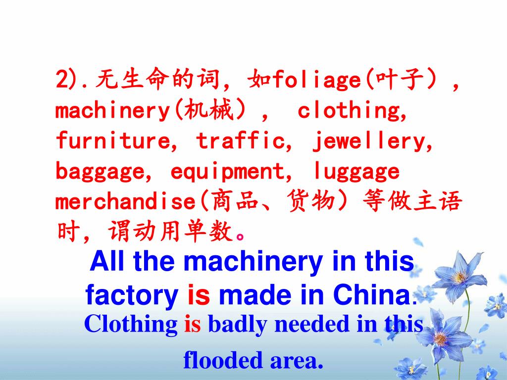 2).无生命的词,如foliage(叶子),machinery(机械), clothing, furniture, traffic, jewellery, baggage, equipment, luggage merchandise(商品、货物)等做主语时,谓动用单数。 All the machinery in this factory is made in China. Clothing is badly needed in this flooded area.