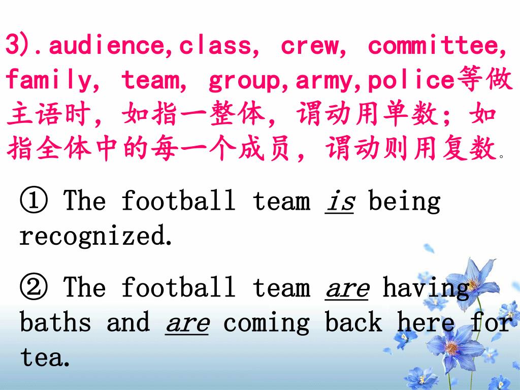 3).audience,class, crew, committee, family, team, group,army,police等做主语时,如指一整体,谓动用单数;如指全体中的每一个成员,谓动则用复数。 ① The football team is being recognized. ② The football team are having baths and are coming back here for tea.