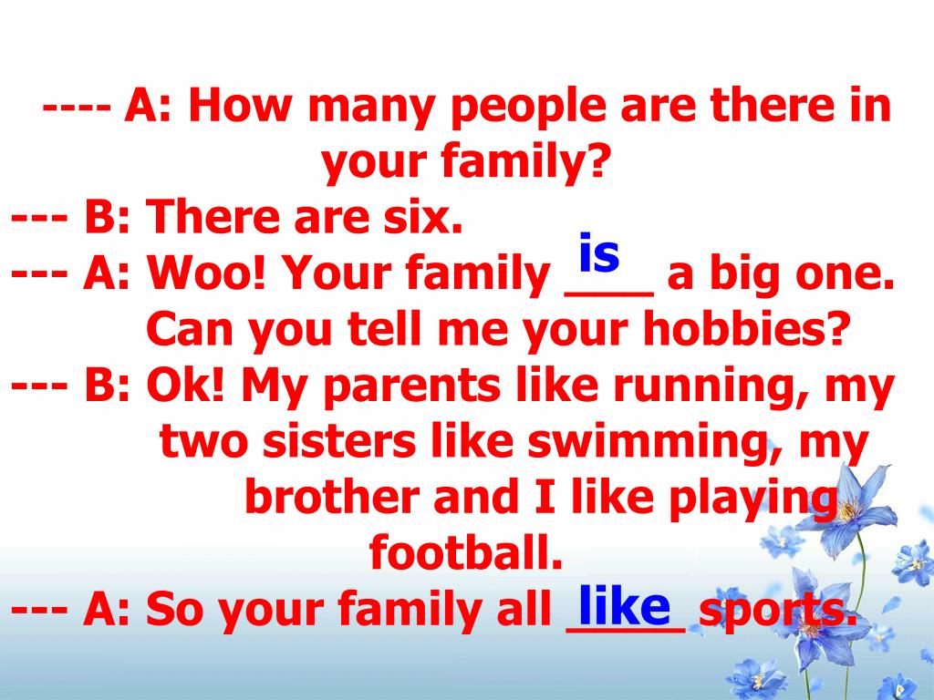 ---- A: How many people are there in your family? --- B: There are six. --- A: Woo! Your family ___ a big one. Can you tell me your hobbies? --- B: Ok! My parents like running, my two sisters like swimming, my brother and I like playing football. --- A: So your family all ____ sports. is like