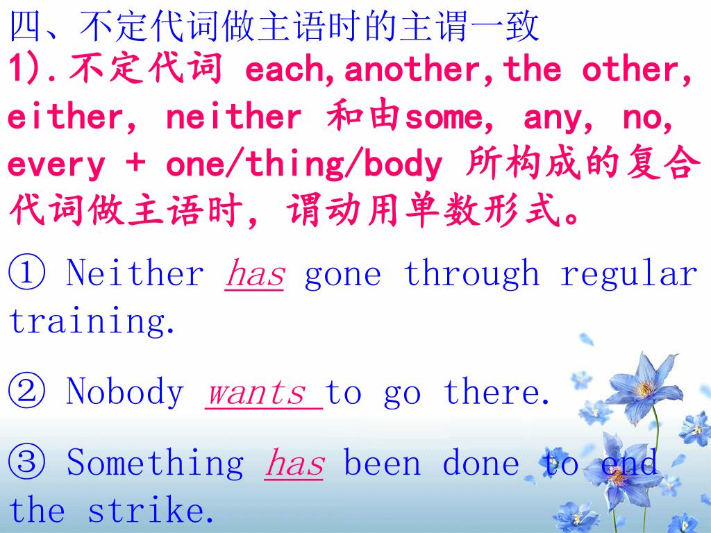 四、不定代词做主语时的主谓一致 1).不定代词 each,another,the other, either, neither 和由some, any, no, every + one/thing/body 所构成的复合代词做主语时,谓动用单数形式。 ① Neither has gone through regular training. ② Nobody wants to go there. ③ Something has been done to end the strike.