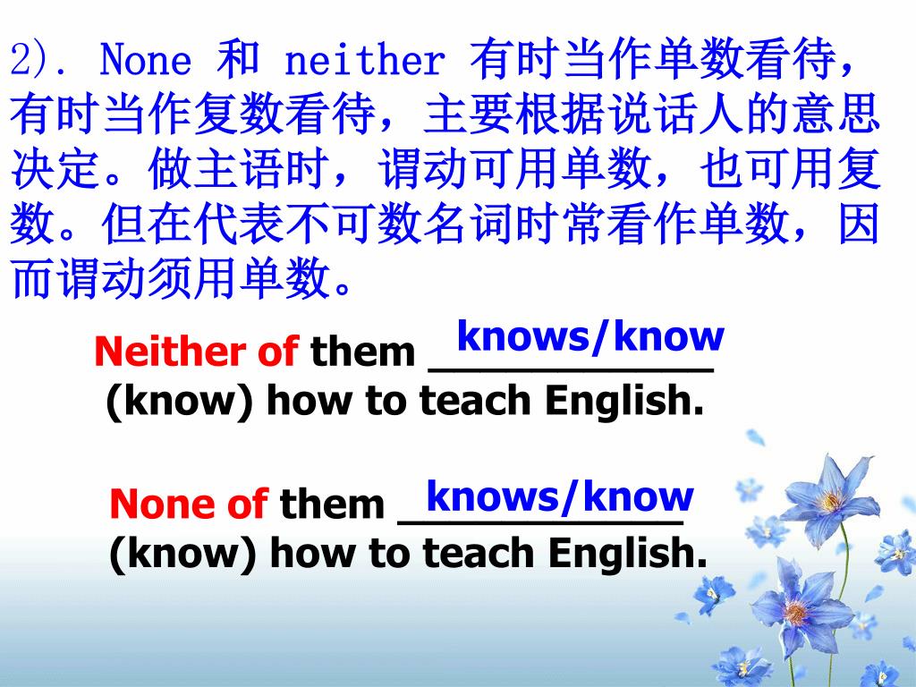 2). None 和 neither 有时当作单数看待,有时当作复数看待,主要根据说话人的意思决定。做主语时,谓动可用单数,也可用复数。但在代表不可数名词时常看作单数,因而谓动须用单数。 knows/know Neitherof them ___________ (know) how to teach English. knows/know None of them ___________ (know) how to teach English.
