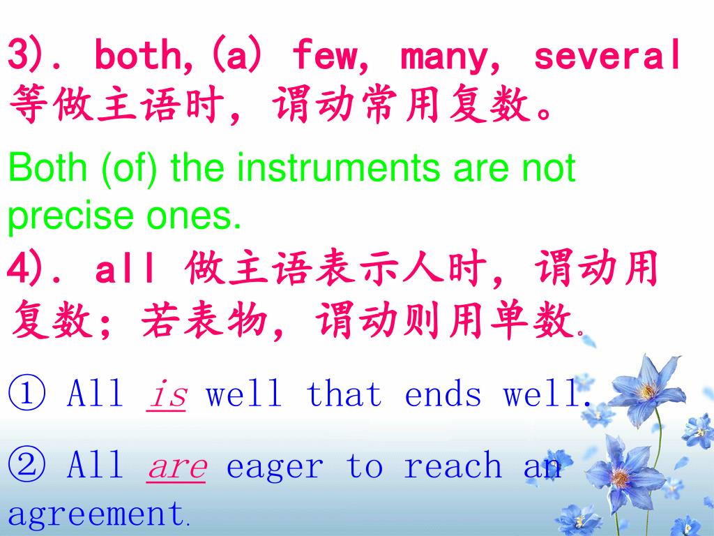 3). both,(a) few, many, several 等做主语时,谓动常用复数。 Both (of) the instruments are not precise ones. 4). all 做主语表示人时,谓动用复数;若表物,谓动则用单数。 ① All is well that ends well. ② All are eager to reach an agreement.