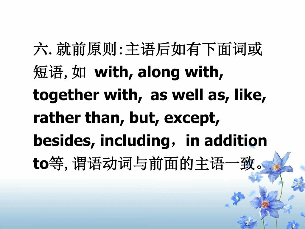 六.就前原则:主语后如有下面词或短语,如 with, along with, together with,as well as, like, rather than, but, except, besides, including,in addition to等,谓语动词与前面的主语一致。