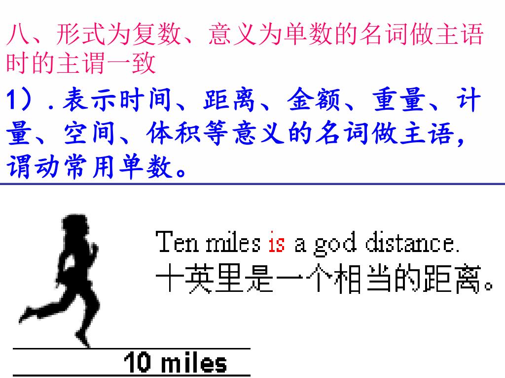 八、形式为复数、意义为单数的名词做主语时的主谓一致八、形式为复数、意义为单数的名词做主语时的主谓一致 1).表示时间、距离、金额、重量、计量、空间、体积等意义的名词做主语,谓动常用单数。