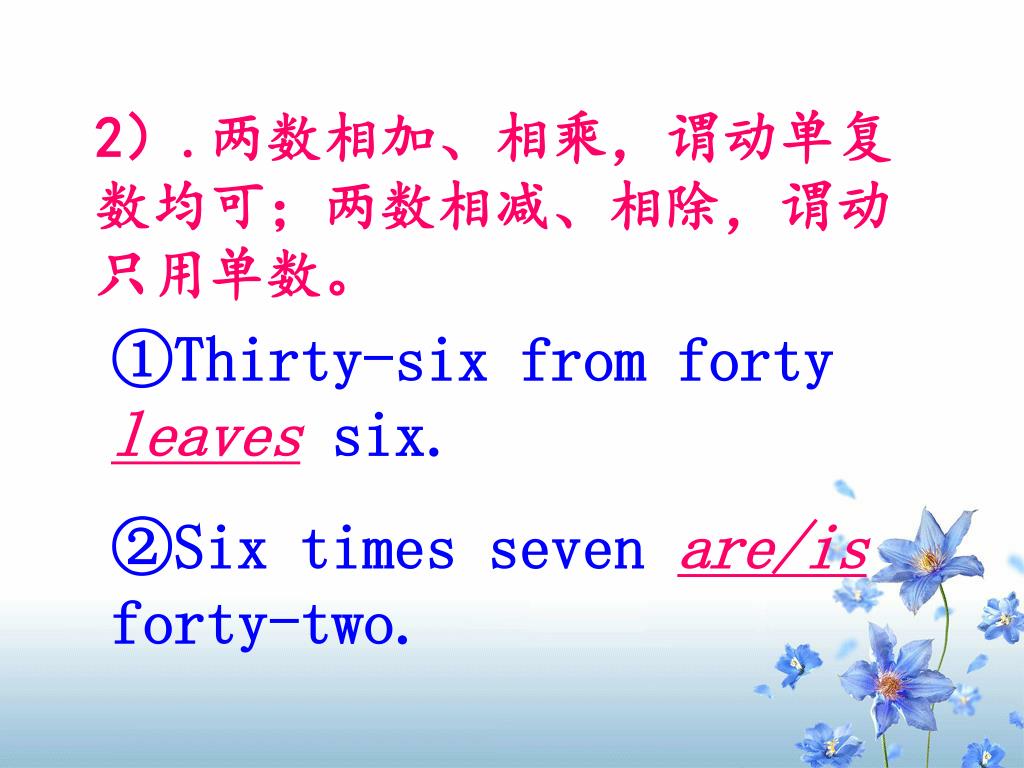 2).两数相加、相乘,谓动单复数均可;两数相减、相除,谓动只用单数。2).两数相加、相乘,谓动单复数均可;两数相减、相除,谓动只用单数。 ①Thirty-six from forty leaves six. ②Six times seven are/is forty-two.