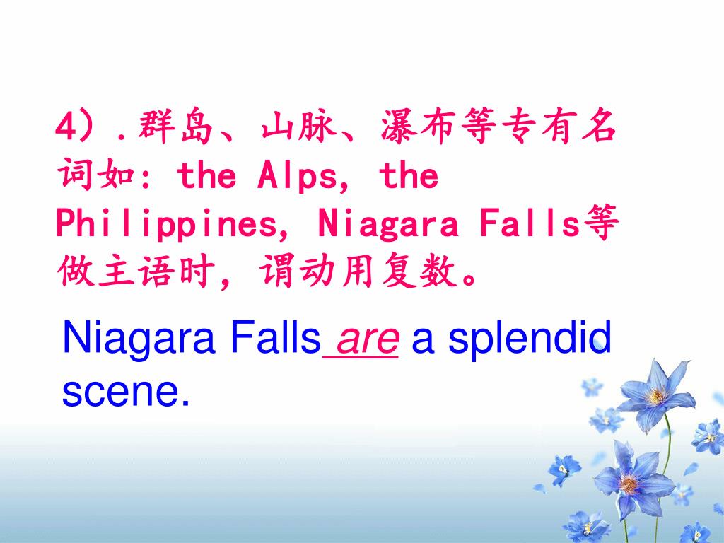 4).群岛、山脉、瀑布等专有名词如: the Alps, the Philippines, Niagara Falls等做主语时,谓动用复数。 Niagara Falls are a splendid scene.