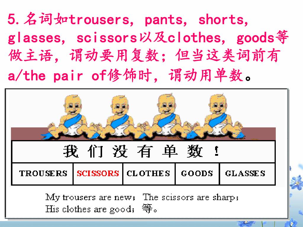 5.名词如trousers, pants, shorts, glasses, scissors以及clothes, goods等做主语,谓动要用复数;但当这类词前有a/the pair of修饰时,谓动用单数。