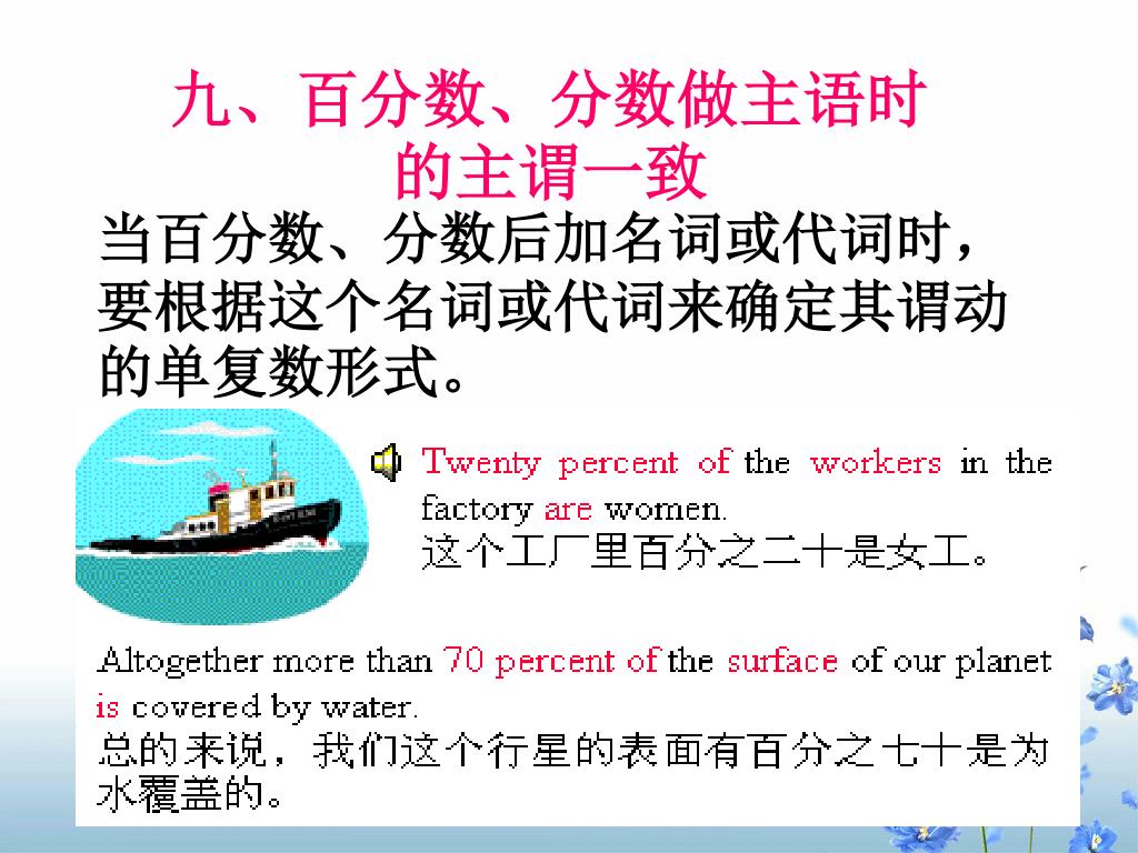 九、百分数、分数做主语时的主谓一致 当百分数、分数后加名词或代词时,要根据这个名词或代词来确定其谓动的单复数形式。