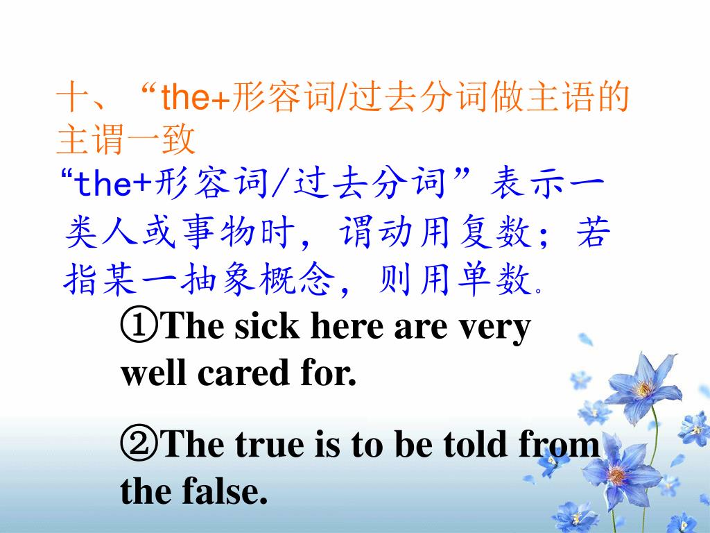 十、“the+形容词/过去分词做主语的主谓一致 “the+形容词/过去分词”表示一类人或事物时,谓动用复数;若指某一抽象概念,则用单数。 ①The sick here are very well cared for. ②The true is to be told from the false.