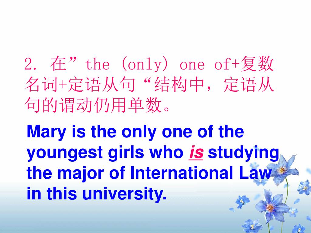 2. 在”the (only) one of+复数名词+定语从句“结构中,定语从句的谓动仍用单数。 Mary is the only one of the youngest girls who is studying the major of International Law in this university.