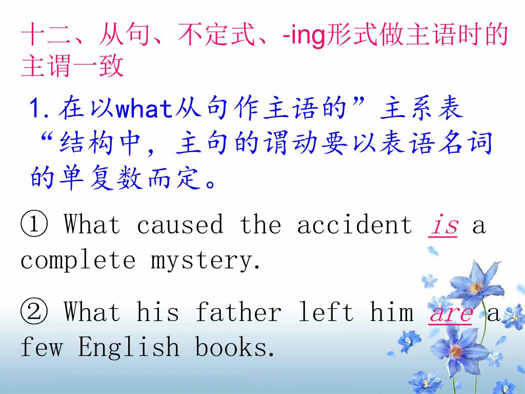 十二、从句、不定式、-ing形式做主语时的主谓一致十二、从句、不定式、-ing形式做主语时的主谓一致 1.在以what从句作主语的”主系表“结构中,主句的谓动要以表语名词的单复数而定。 ① What caused the accident is a complete mystery. ② What his father left him are a few English books.