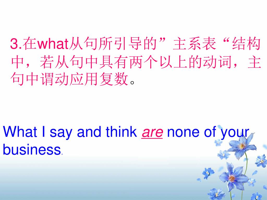 3.在what从句所引导的”主系表“结构中,若从句中具有两个以上的动词,主句中谓动应用复数。3.在what从句所引导的”主系表“结构中,若从句中具有两个以上的动词,主句中谓动应用复数。 What I say and think are none of your business.