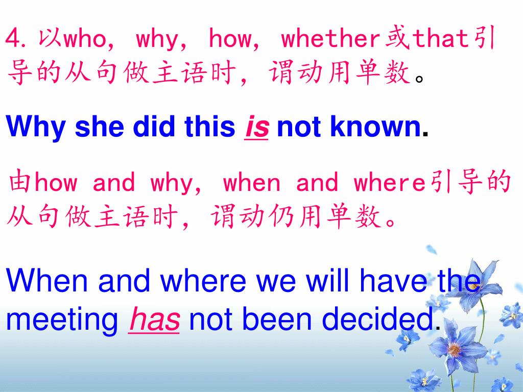4.以who, why, how, whether或that引导的从句做主语时,谓动用单数。 Why she did this is not known. 由how and why, when and where引导的从句做主语时,谓动仍用单数。 When and where we will have the meeting has not been decided.