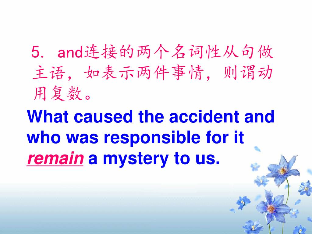 5. and连接的两个名词性从句做主语,如表示两件事情,则谓动用复数。 What caused the accident and who was responsible for it remain a mystery to us.