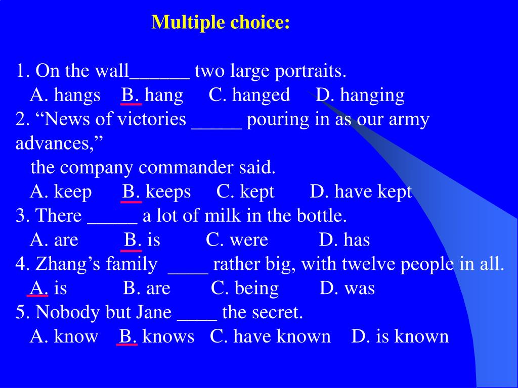 Multiple choice: 1. On the wall______ two large portraits. A. hangs B. hang C. hanged D. hanging 2. “News of victories _____ pouring in as our army advances,” the company commander said. A. keep B. keeps C. kept D. have kept 3. There _____ a lot of milk in the bottle. A. are B. is C. were D. has 4. Zhang’s family ____ rather big, with twelve people in all. A. is B. are C. being D. was 5. Nobody but Jane ____ the secret. A. know B. knows C. have known D. is known