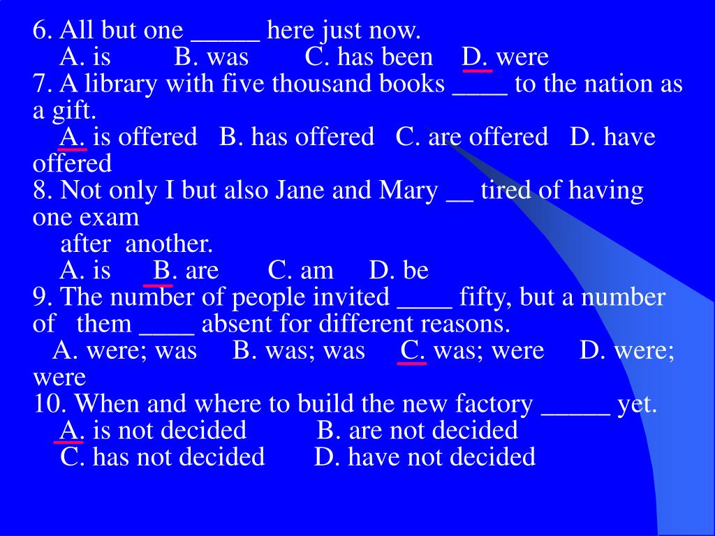 6. All but one _____ here just now. A. is B. was C. has been D. were 7. A library with five thousand books ____ to the nation as a gift. A. is offered B. has offered C. are offered D. have offered 8. Not only I but also Jane and Mary __ tired of having one exam after another. A. is B. are C. am D. be 9. The number of people invited ____ fifty, but a number of them ____ absent for different reasons. A. were; was B. was; was C. was; were D. were; were 10. When and where to build the new factory _____ yet. A. is not decided B. are not decided C. has not decided D. have not decided