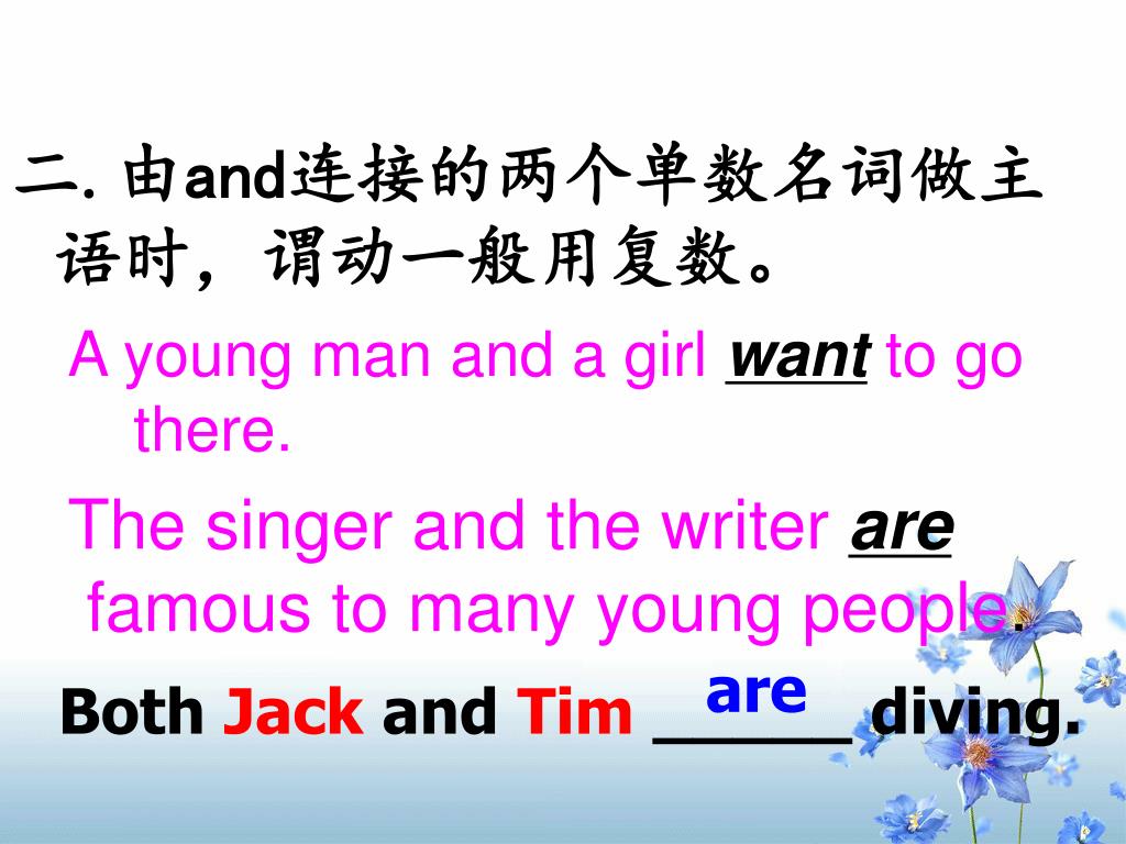 A young man and a girl wantto go there. The singer and the writer are famous to many young people. 二.由and连接的两个单数名词做主语时,谓动一般用复数。 are Both Jack and Tim _____ diving.