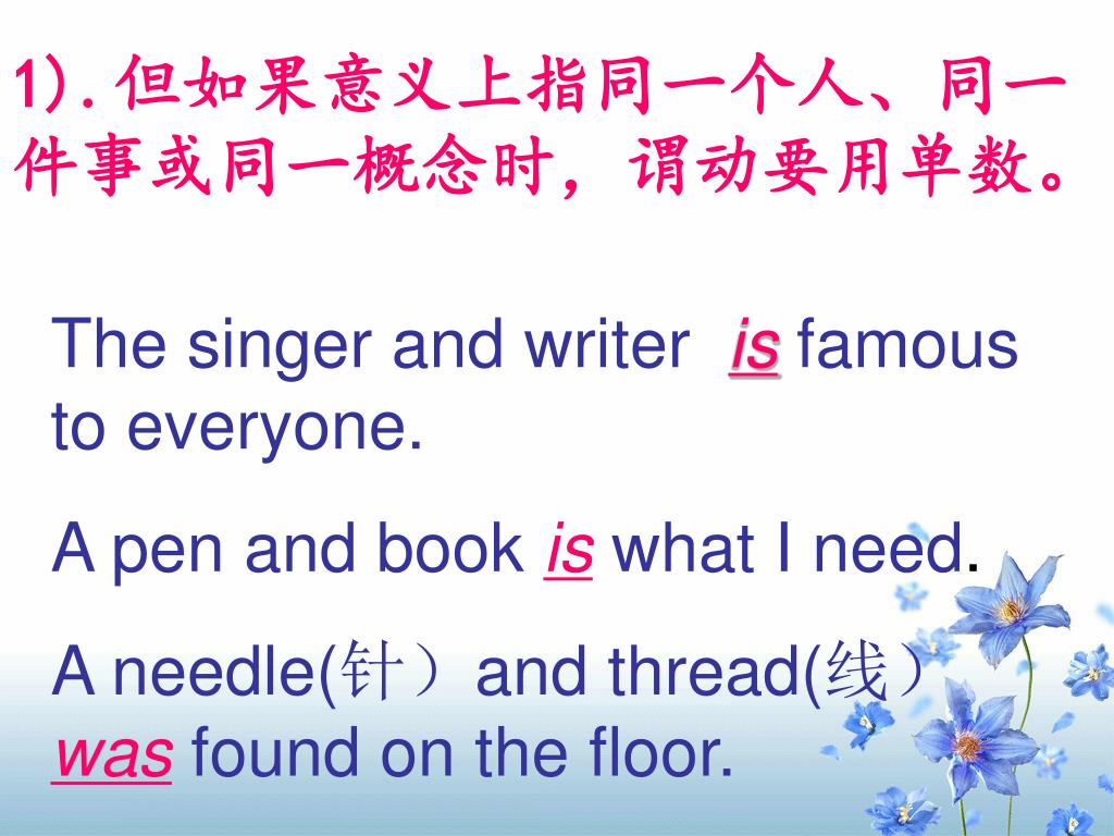 1).但如果意义上指同一个人、同一件事或同一概念时,谓动要用单数。1).但如果意义上指同一个人、同一件事或同一概念时,谓动要用单数。 The singer and writer is famous to everyone. A pen and book is what I need. A needle(针)and thread(线)was found on the floor.