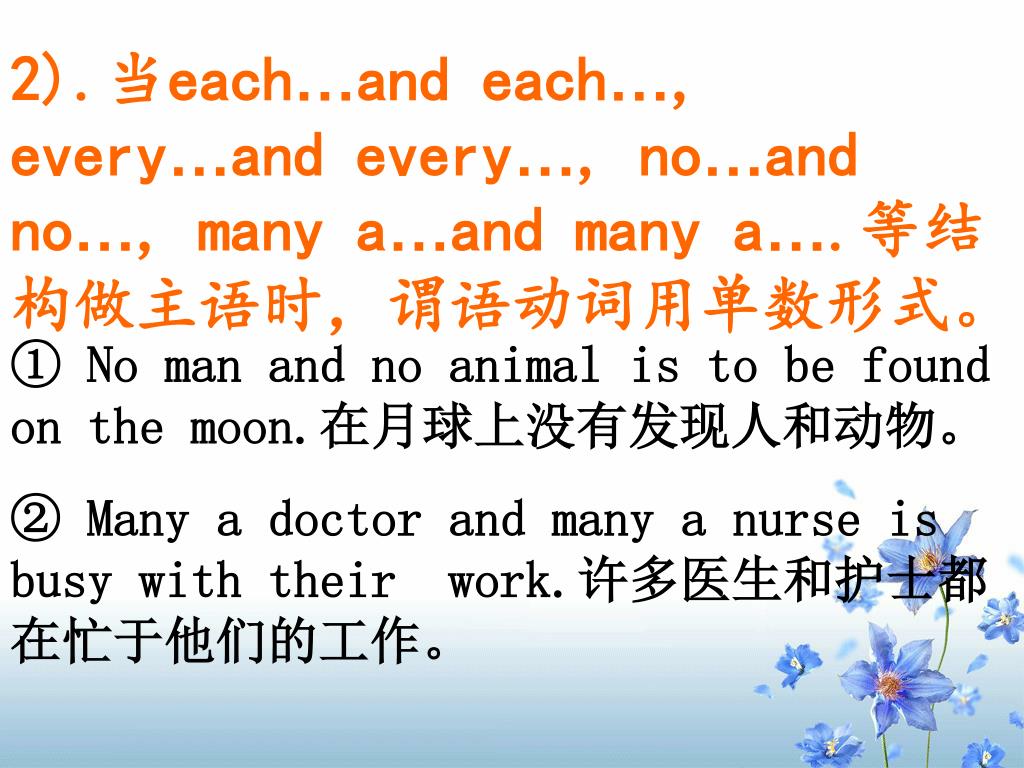 2).当each…and each…, every…and every…, no…and no…, many a…and many a….等结构做主语时,谓语动词用单数形式。 ① No man and no animal is to be found on the moon.在月球上没有发现人和动物。 ② Many a doctor and many a nurse is busy with their work.许多医生和护士都在忙于他们的工作。