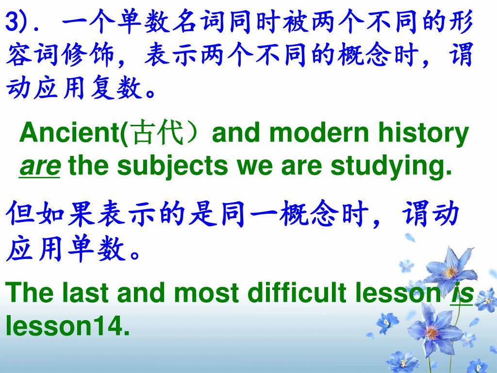 3). 一个单数名词同时被两个不同的形容词修饰,表示两个不同的概念时,谓动应用复数。 Ancient(古代)and modern history are the subjects we are studying. 但如果表示的是同一概念时,谓动应用单数。 The last and most difficult lesson is lesson14.