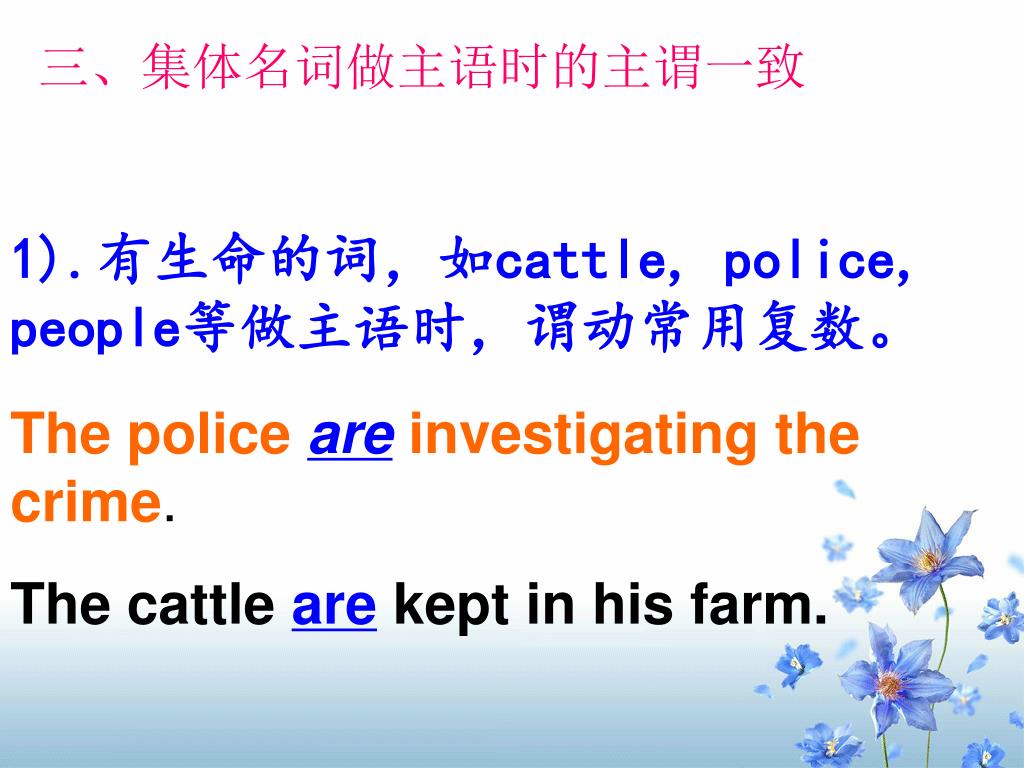 三、集体名词做主语时的主谓一致 1).有生命的词,如cattle, police, people等做主语时,谓动常用复数。 The police are investigating the crime. The cattle are kept in his farm.
