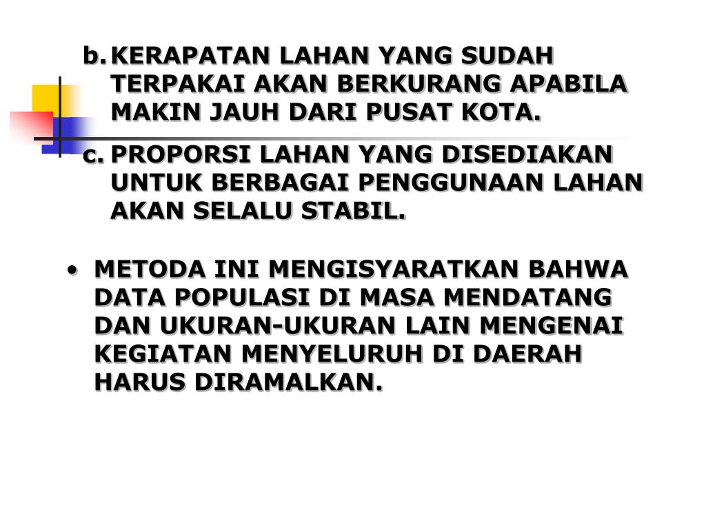 KERAPATAN LAHAN YANG SUDAH TERPAKAI AKAN BERKURANG APABILA MAKIN JAUH DARI PUSAT KOTA. • PROPORSI LAHAN YANG DISEDIAKAN UNTUK BERBAGAI PENGGUNAAN LAHAN AKAN SELALU STABIL. • METODA INI MENGISYARATKAN BAHWA DATA POPULASI DI MASA MENDATANG DAN UKURAN-UKURAN LAIN MENGENAI KEGIATAN MENYELURUH DI DAERAH HARUS DIRAMALKAN.
