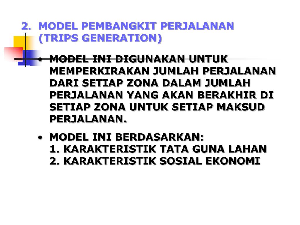 2. MODEL PEMBANGKIT PERJALANAN (TRIPS GENERATION) • MODEL INI DIGUNAKAN UNTUK MEMPERKIRAKAN JUMLAH PERJALANAN DARI SETIAP ZONA DALAM JUMLAH PERJALANAN YANG AKAN BERAKHIR DI SETIAP ZONA UNTUK SETIAP MAKSUD PERJALANAN. • MODEL INI BERDASARKAN: • 1. KARAKTERISTIK TATA GUNA LAHAN • 2. KARAKTERISTIK SOSIAL EKONOMI