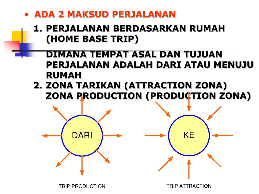 ADA 2 MAKSUD PERJALANAN • 1. PERJALANAN BERDASARKAN RUMAH (HOME BASE TRIP) • DIMANA TEMPAT ASAL DAN TUJUAN PERJALANAN ADALAH DARI ATAU MENUJU RUMAH • ZONA TARIKAN (ATTRACTION ZONA) • ZONA PRODUCTION (PRODUCTION ZONA)