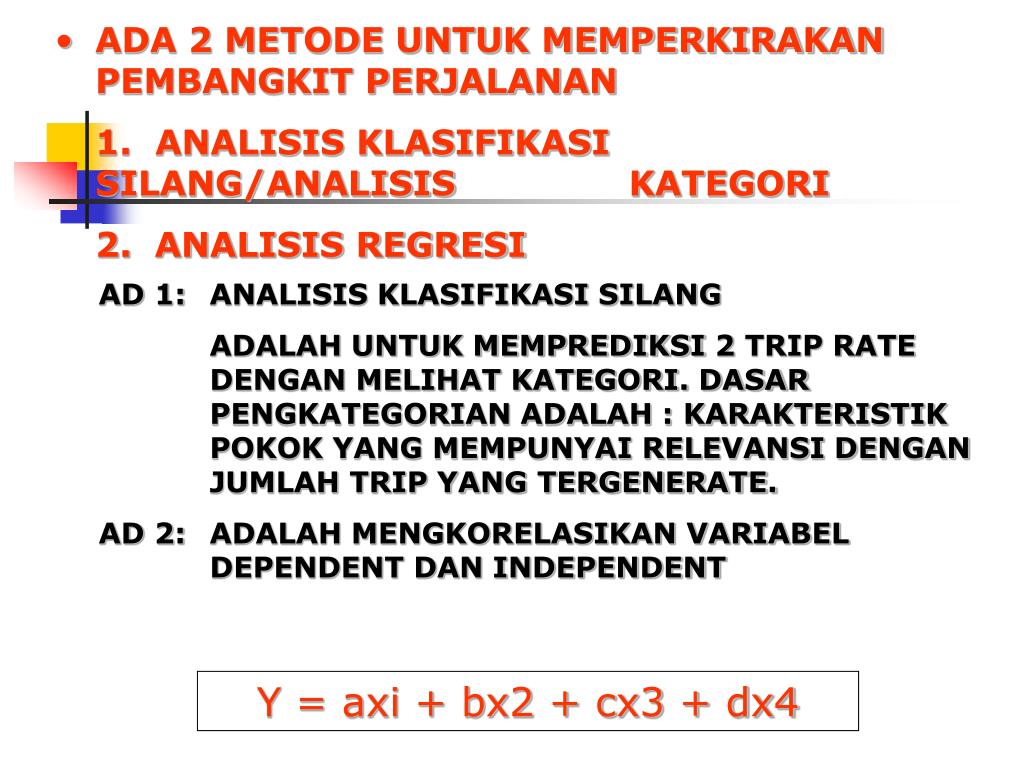 MISAL: Y = 10,2+1,68HI + 2,09CI + 1,98DI DIMANA Y = JUMLAH PERJALANAN UNTUK MAKSUD TERTENTU YANG DIBANGKITKAN PADA ZONA I HI = JUMLAH RT DI ZONA I CI = JUMLAH MOBIL YANG DIPUNYAI SELURUH RT DI ZONA WI = JUMLAH PEKERJA YANG TINGGAL DI ZONA I