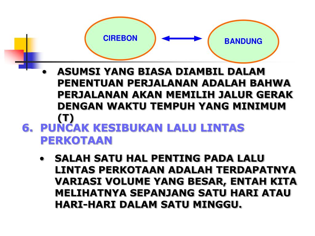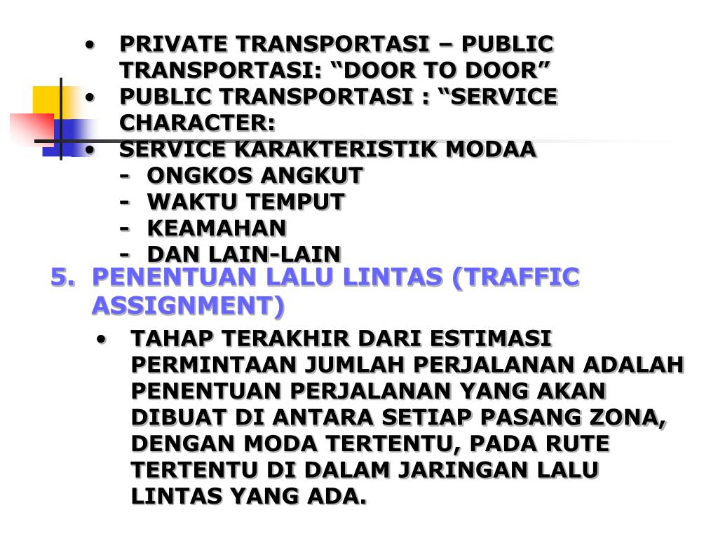 PRIVATE TRANSPORTASI – PUBLIC TRANSPORTASI: “DOOR TO DOOR” • PUBLIC TRANSPORTASI : “SERVICE CHARACTER: • SERVICE KARAKTERISTIK MODAA • - ONGKOS ANGKUT • - WAKTU TEMPUT • - KEAMAHAN • - DAN LAIN-LAIN 5. PENENTUAN LALU LINTAS (TRAFFIC ASSIGNMENT) • TAHAP TERAKHIR DARI ESTIMASI PERMINTAAN JUMLAH PERJALANAN ADALAH PENENTUAN PERJALANAN YANG AKAN DIBUAT DI ANTARA SETIAP PASANG ZONA, DENGAN MODA TERTENTU, PADA RUTE TERTENTU DI DALAM JARINGAN LALU LINTAS YANG ADA.