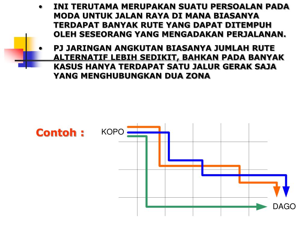 INI TERUTAMA MERUPAKAN SUATU PERSOALAN PADA MODA UNTUK JALAN RAYA DI MANA BIASANYA TERDAPAT BANYAK RUTE YANG DAPAT DITEMPUH OLEH SESEORANG YANG MENGADAKAN PERJALANAN. • PJ JARINGAN ANGKUTAN BIASANYA JUMLAH RUTE ALTERNATIF LEBIH SEDIKIT, BAHKAN PADA BANYAK KASUS HANYA TERDAPAT SATU JALUR GERAK SAJA YANG MENGHUBUNGKAN DUA ZONA Contoh :
