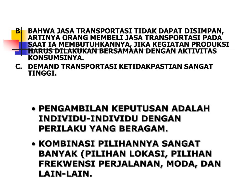 B. BAHWA JASA TRANSPORTASI TIDAK DAPAT DISIMPAN, ARTINYA ORANG MEMBELI JASA TRANSPORTASI PADA SAAT IA MEMBUTUHKANNYA, JIKA KEGIATAN PRODUKSI HARUS DILAKUKAN BERSAMAAN DENGAN AKTIVITAS KONSUMSINYA. C. DEMAND TRANSPORTASI KETIDAKPASTIAN SANGAT TINGGI. • PENGAMBILAN KEPUTUSAN ADALAH INDIVIDU-INDIVIDU DENGAN PERILAKU YANG BERAGAM. • KOMBINASI PILIHANNYA SANGAT BANYAK (PILIHAN LOKASI, PILIHAN FREKWENSI PERJALANAN, MODA, DAN LAIN-LAIN.