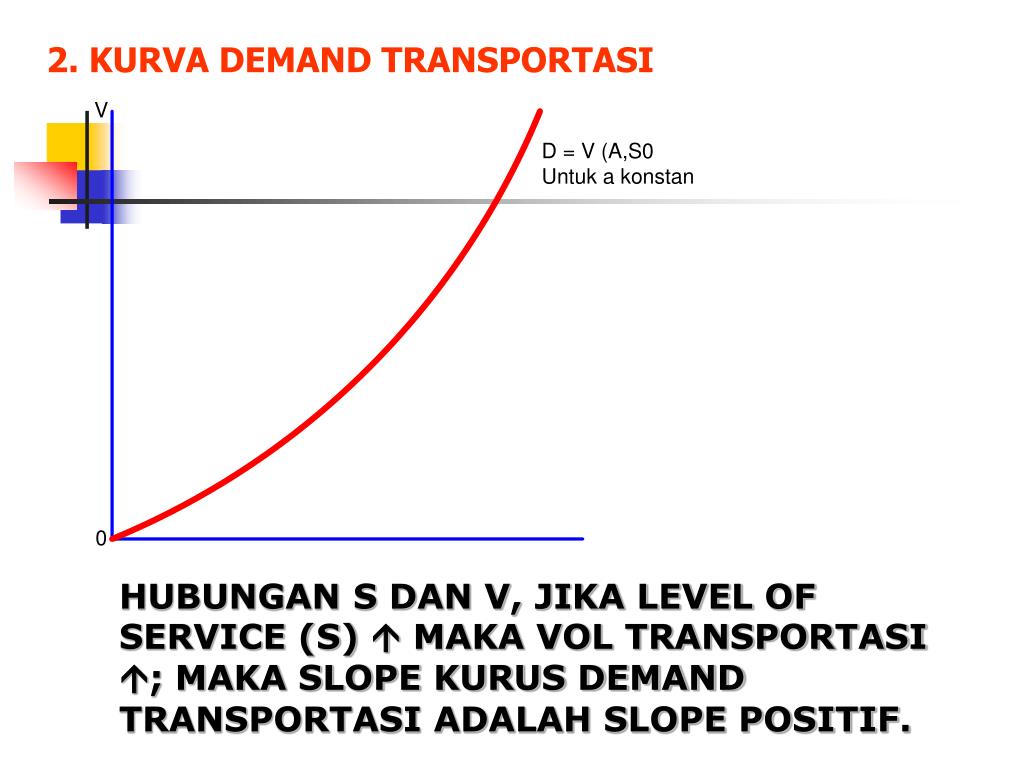 2. KURVA DEMAND TRANSPORTASI HUBUNGAN S DAN V, JIKA LEVEL OF SERVICE (S) MAKA VOL TRANSPORTASI ; MAKA SLOPE KURUS DEMAND TRANSPORTASI ADALAH SLOPE POSITIF.
