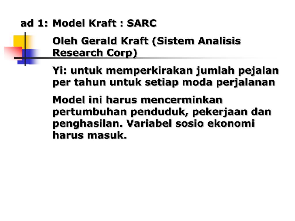 ad 1: Model Kraft : SARC Oleh Gerald Kraft (Sistem Analisis Research Corp) Yi: untuk memperkirakan jumlah pejalan per tahun untuk setiap moda perjalanan Model ini harus mencerminkan pertumbuhan penduduk, pekerjaan dan penghasilan. Variabel sosio ekonomi harus masuk.
