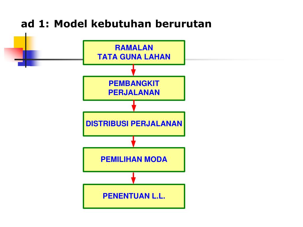 KEBUTUHAN PERJALANAN BERURUTAN 1. RAMALAN TATA GUNA LAHAN • SECARA IDEAL PARA PERENCANA DAN INSINYUR TRANSPORTASI INGIN MEMBERIKAN PERKIRAAN TERHADAP POLA KEGIATAN MANUSIA DI DALAM DAERAH PERKOTAAN UNTUK MASA-MASA MENDATANG, TERUTAMA PADA TAHUN TERTENTU YANG HENDAK DIRAMALKAN • INTENSITAS PENGEMBANGAN LAHAN AKAN BERKURANG APABILA MAKIN JAUH DARI PUSAT KOTA.