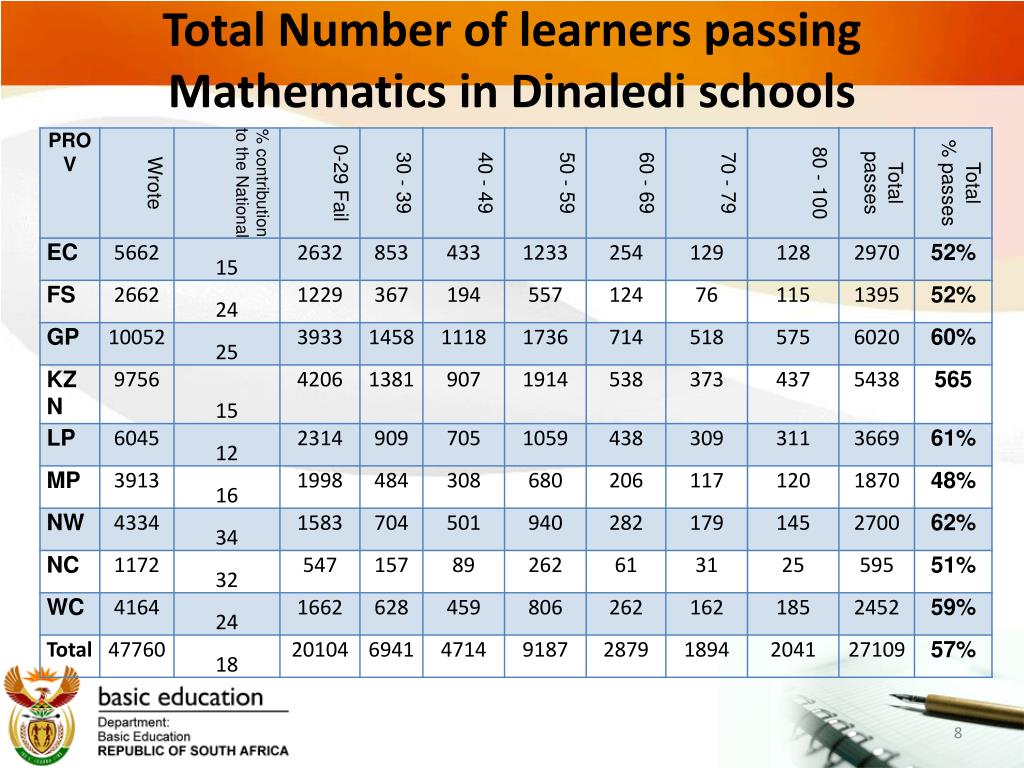 The aim is to increase this to around one in five by 2014 and one in three by 2025, for each subject. To this effect , Government has for a number of years been paying special attention to improving mathematics and physical science results in Grades 10 to 12. An important programme of government is Dinaledi, which started in 2001. In 2007 this programme was expanded so that it covered almost 500 schools. Recent evaluations by experts have found that the additional training and resources going to Dinaledi schools did make a difference to Grade 12 results, especially in schools in poorer areas. The challenge is to improve the Dinaledi approach further and to include more schools. STRATEGY Mathematics and Science Improvement Strategy