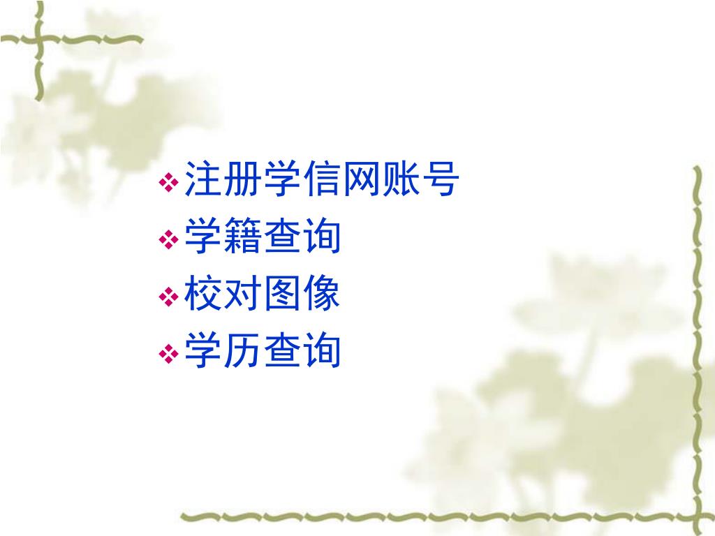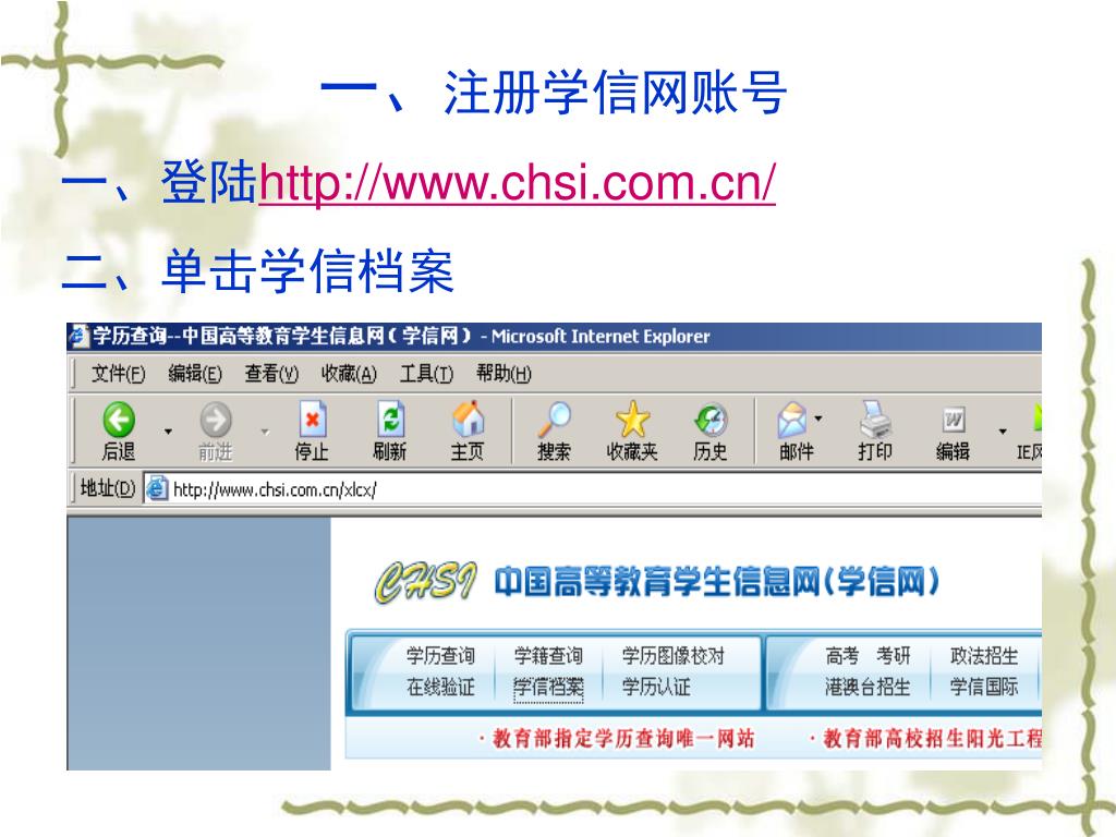 å¦ä¿¡æ¡£æ¡ˆ. å¦ç±ç§‘ 201 2 å¹´ 10 月. 注册使用æµç¨‹. 注册å¦ä¿¡ç½‘è´¦å· å¦ç±æŸ¥è¯¢ æ ¡å¯¹å›¾åƒ å¦åŽ†æŸ¥è¯¢. 一〠注册å¦ä¿¡ç½‘è´¦å· ä¸€ã€ç™»é™† http://www.chsi.com.cn/ 二ã€å•击å¦ä¿¡æ¡£æ¡ˆ. 三ã€å•击注册å¦ä¿¡ç½‘è´¦å·. 用户å输入自己的邮箱地å€. å››ã€è¾“入:用户å(邮箱地å€ï¼‰ã€å¯†ç ã€å¯†ç 确认,å•å‡»ç«‹å³æ³¨å†Œ. 五ã€å•å‡»ç«‹å³æŸ¥çœ‹é‚®ç®± —— 输入用户åã€å¯†ç åŠéªŒè¯ç —— å•击登陆 —— 进入邮箱 —— 打开收件箱 —— 找到å¦ä¿¡ç½‘呿¥çš„邮件å•击打开 —— å•击链接激活账户. å¦‚å®žå¡«å†™ä¸æ–‡å§“å.