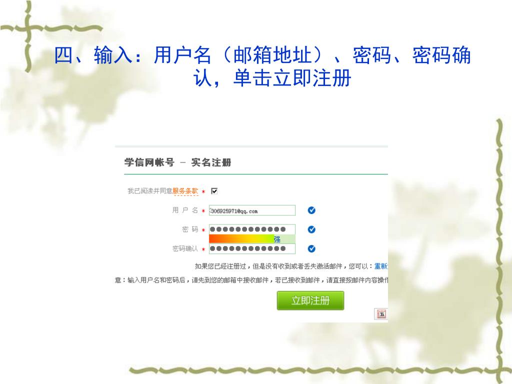 四、输入:用户名(邮箱地址)、密码、密码确认,单击立即注册四、输入:用户名(邮箱地址)、密码、密码确认,单击立即注册