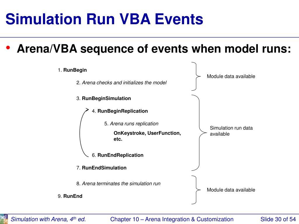 Module data available Module data available Simulation run data available 1. RunBegin 2. Arena checks and initializes the model 3. RunBeginSimulation 4. RunBeginReplication 5. Arena runs replication OnKeystroke, UserFunction, etc. 6. RunEndReplication 7. RunEndSimulation 8. Arena terminates the simulation run 9. RunEnd Simulation Run VBA Events • Arena/VBA sequence of events when model runs: Chapter 10 – Arena Integration & Customization