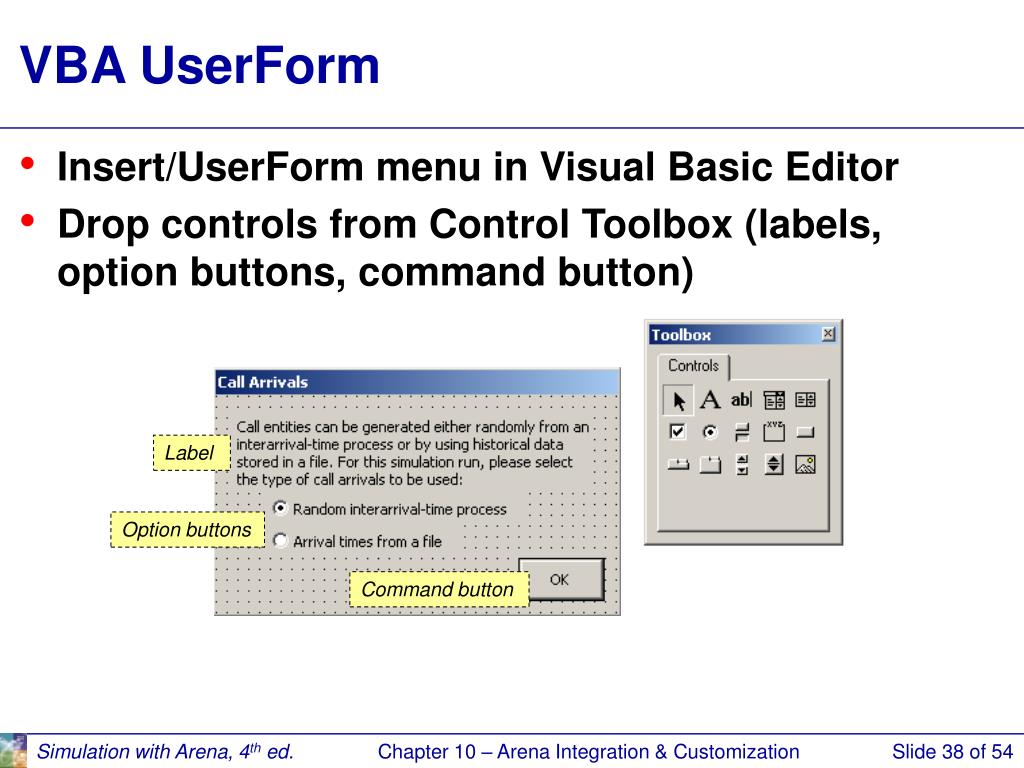 VBA UserForm • Insert/UserForm menu in Visual Basic Editor • Drop controls from Control Toolbox (labels, option buttons, command button) Label Option buttons Command button Chapter 10 – Arena Integration & Customization