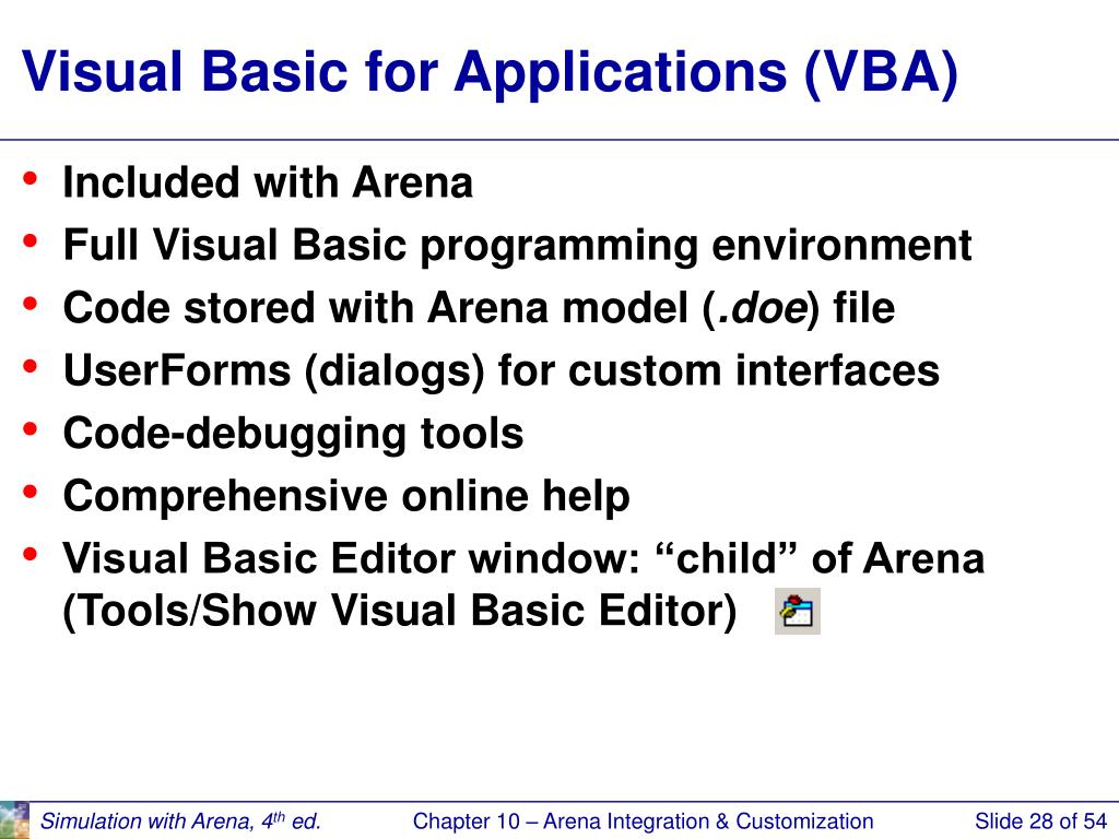 Visual Basic for Applications (VBA) • Included with Arena • Full Visual Basic programming environment • Code stored with Arena model (.doe) file • UserForms (dialogs) for custom interfaces • Code-debugging tools • Comprehensive online help • Visual Basic Editor window: “child” of Arena (Tools/Show Visual Basic Editor) Chapter 10 – Arena Integration & Customization