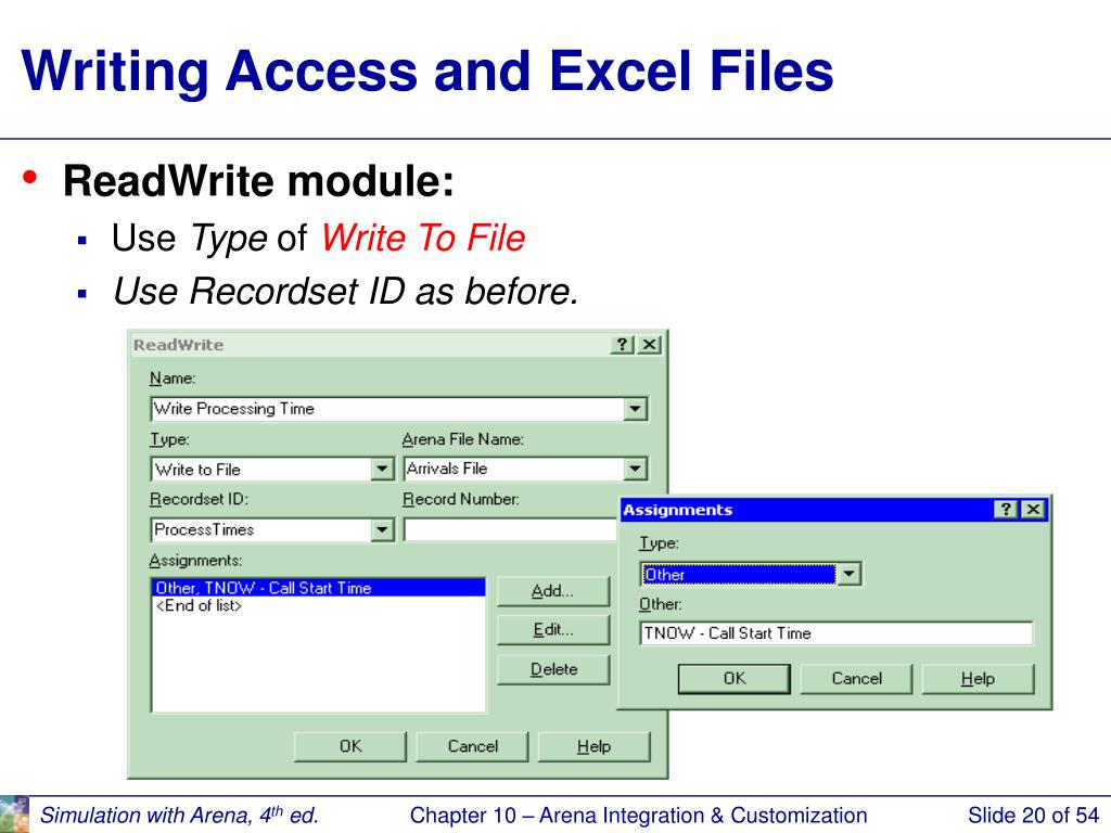 Writing Access and Excel Files • ReadWrite module: • Use Type of Write To File • Use Recordset ID as before. Chapter 10 – Arena Integration & Customization
