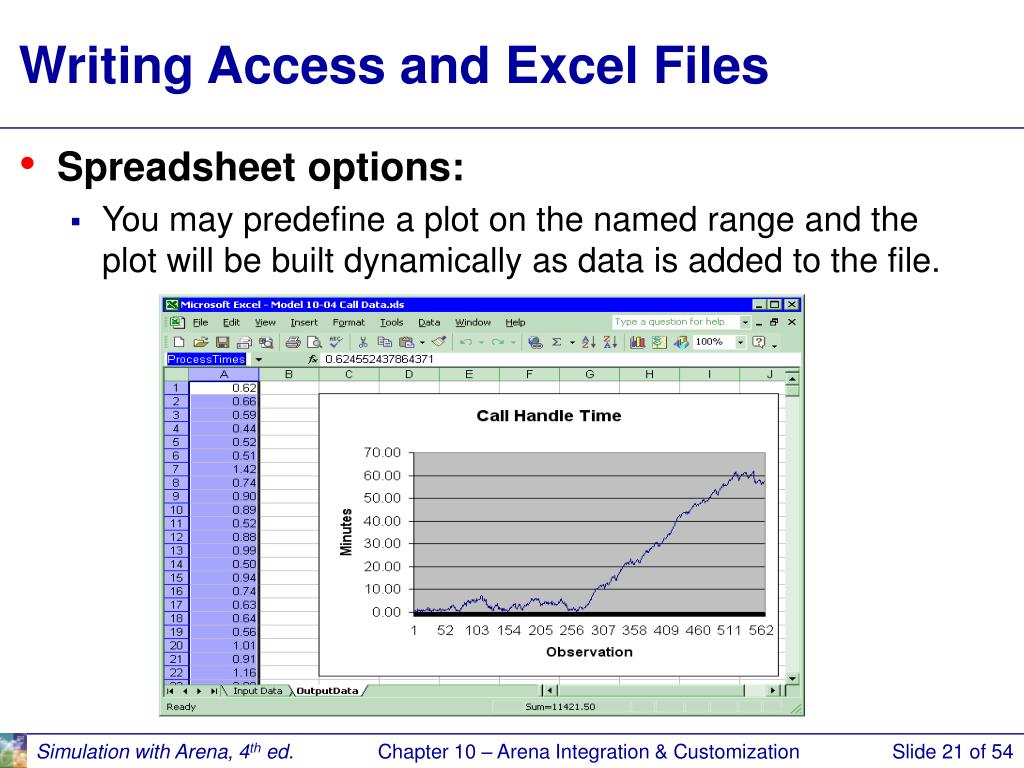 Writing Access and Excel Files • Spreadsheet options: • You may predefine a plot on the named range and the plot will be built dynamically as data is added to the file. Chapter 10 – Arena Integration & Customization