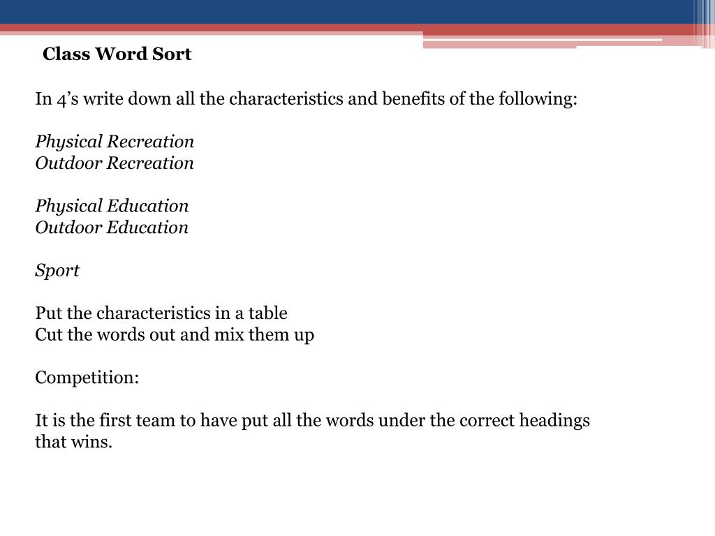 Class Word Sort In 4’s write down all the characteristics and benefits of the following: Physical Recreation Outdoor Recreation Physical Education Outdoor Education Sport Put the characteristics in a table Cut the words out and mix them up Competition: It is the first team to have put all the words under the correct headings that wins.
