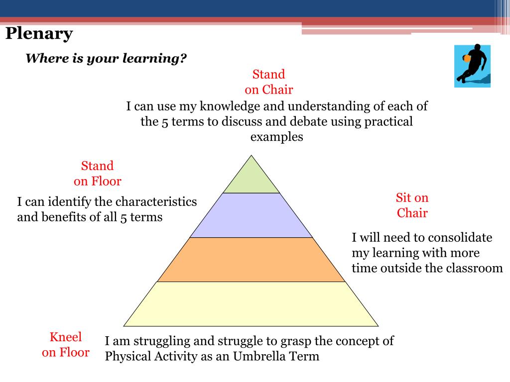 Plenary Where is your learning? Stand on Chair I can use my knowledge and understanding of each of the 5 terms to discuss and debate using practical examples Stand on Floor Sit on Chair I can identify the characteristics and benefits of all 5 terms I will need to consolidate my learning with more time outside the classroom Kneel on Floor I am struggling and struggle to grasp the concept of Physical Activity as an Umbrella Term