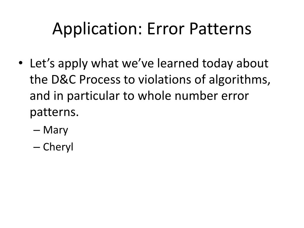 Application: Error Patterns • Let’s apply what we’ve learned today about the D&C Process to violations of algorithms, and in particular to whole number error patterns. • Mary • Cheryl