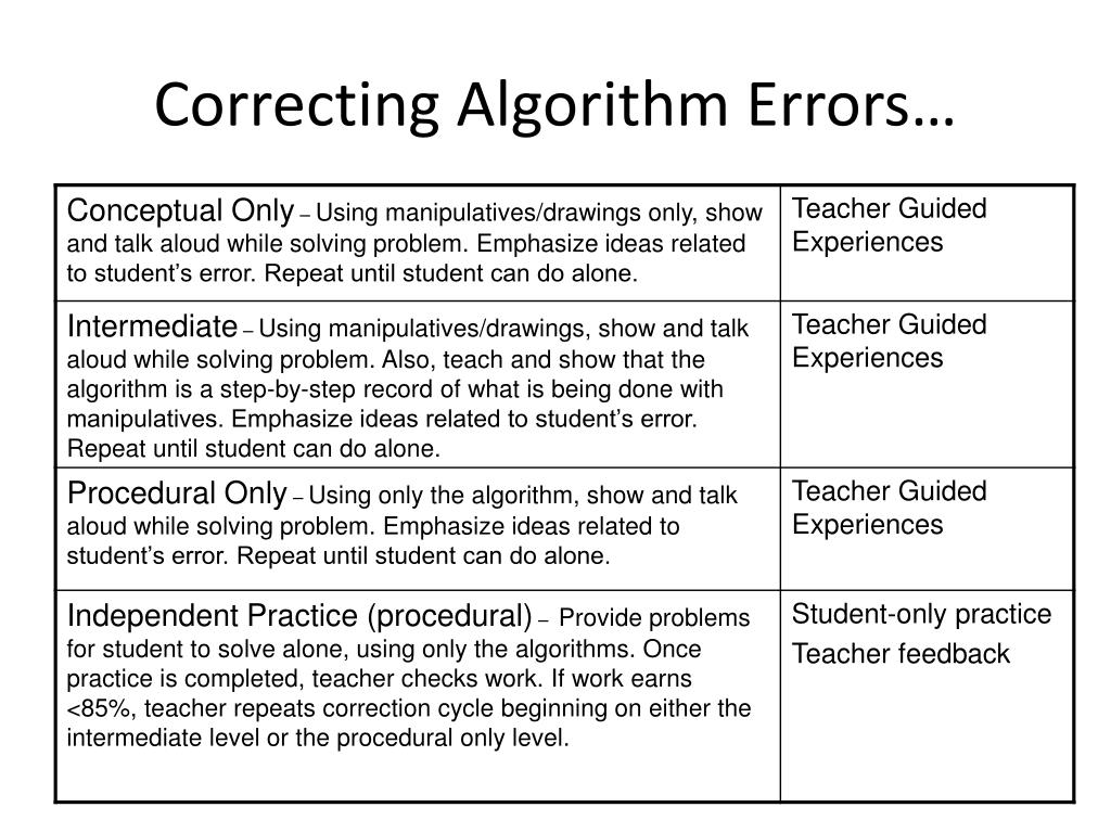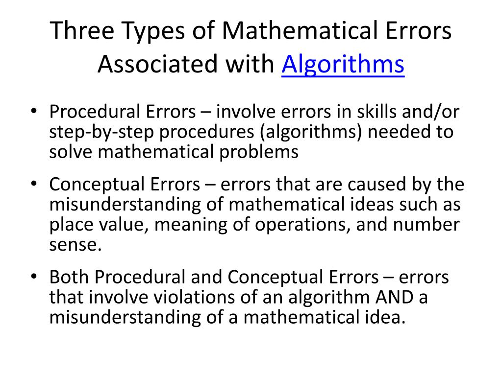 Three Types of Mathematical Errors Associated with Algorithms • Procedural Errors – involve errors in skills and/or step-by-step procedures (algorithms) needed to solve mathematical problems • Conceptual Errors – errors that are caused by the misunderstanding of mathematical ideas such as place value, meaning of operations, and number sense. • Both Procedural and Conceptual Errors – errors that involve violations of an algorithm AND a misunderstanding of a mathematical idea.