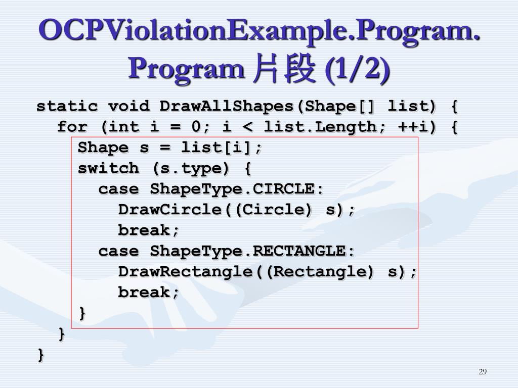 OCPViolationExample.Program.Program 片段 (1/2) static void DrawAllShapes(Shape[] list){ for (int i = 0; i < list.Length; ++i){ Shape s = list[i]; switch (s.type){ case ShapeType.CIRCLE: DrawCircle((Circle) s); break; case ShapeType.RECTANGLE: DrawRectangle((Rectangle) s); break; } } }